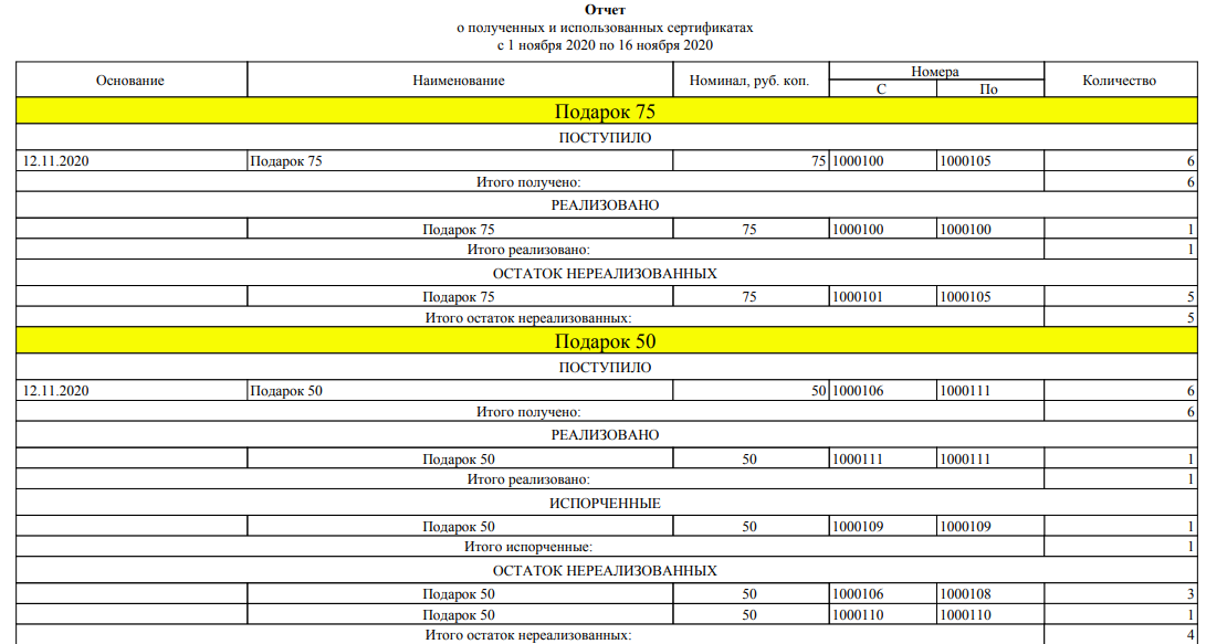 В сгенерированных отчетах представлена информация о поступлении, наличии и списаниях испорченных сертификатов на выбранном складе.
