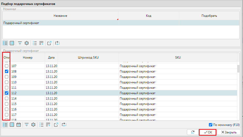 Чтобы выдать сертификаты покупателю, необходимо нажать кнопку Отпуск сертификатов покупателю, отметить номера ПС в открывшейся форме и нажать ОК.