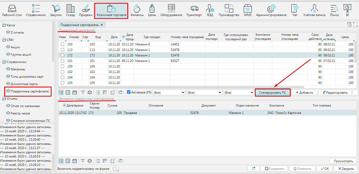 Основная работа с подарочными сертификатами осуществляется на форме Рабочий стол - Подарочные сертификаты. На вкладке Сертификаты отображаются все сертификаты, которые есть в системе и информация об их выпуске, продаже и использовании.