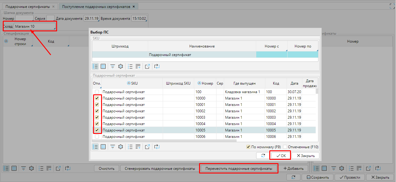 Выбрать склад, на который мы будем перемещать, нажать кнопку Переместить ПС, выбрать ПС, которые мы будем перемещать на этот склад, нажать ОК и после этого Провести документ.