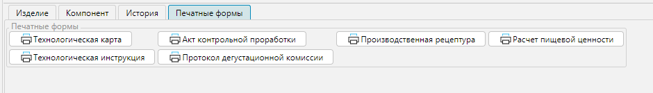На вкладке Печатные формы можно распечатать ряд документов, которые формируются, используя информацию из спецификации, например технологическую карту или рецептуру.