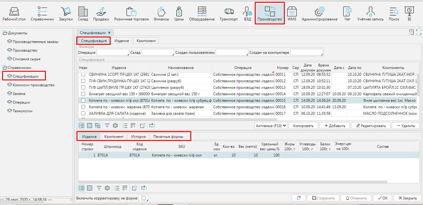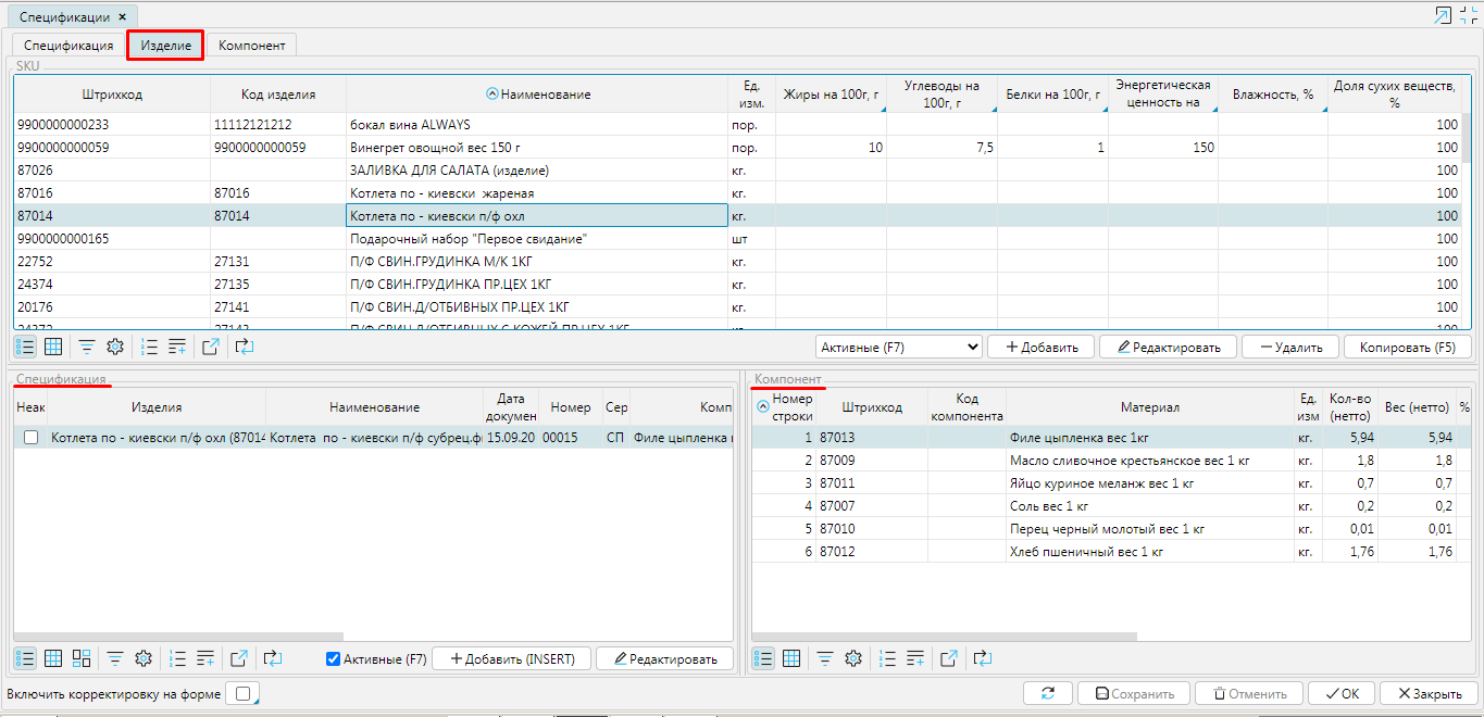 На закладках Изделие и Компонент соответственно в основном блоке отображается список готовых изделий или компонентов, а в дополнительных спецификации, которые используются для приготовления выделенного изделия/в которых используется выделенный компонент, и компоненты / изделия по выделенным спецификациям.