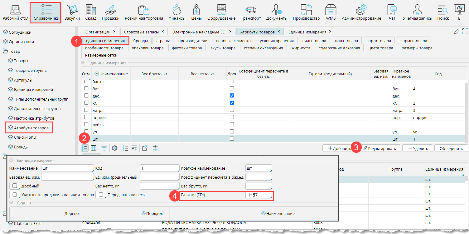 Чтобы единица измерения товара передавалась в электронной накладной, необходимо указать ее международный 3-х буквенный код единицы измерения, который используется для EDI.