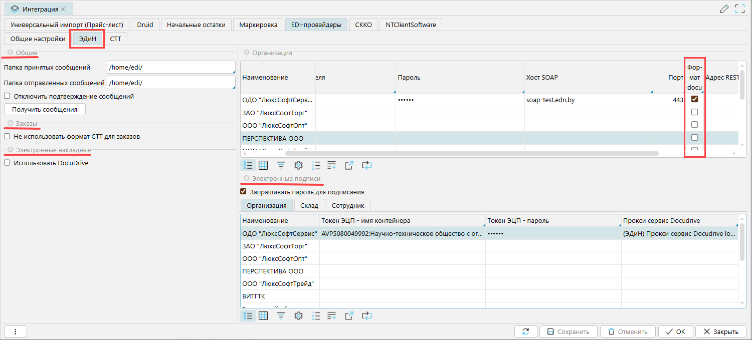 В карточке организации в блоке EDI настраиваются следующие параметры работы с электронными документами.