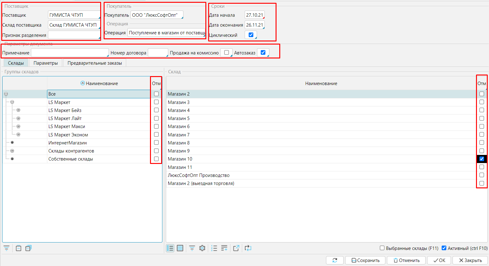 На вкладке Склады указываются склад(ы) покупателя, на которые будут формироваться заказы по данному графику. Можно отметить всю группу складов или отдельные склады и магазины.