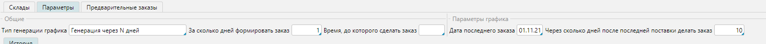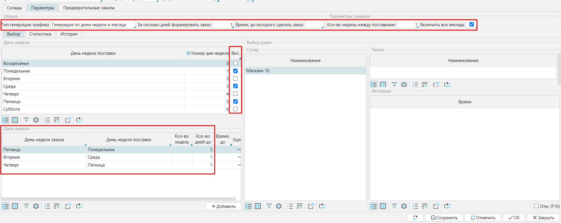На вкладке Параметры настраивается непосредственно график создания заказов. Необходимо указать системе, когда должна быть поставка, и за какое время до поставки необходимо сделать заказ.