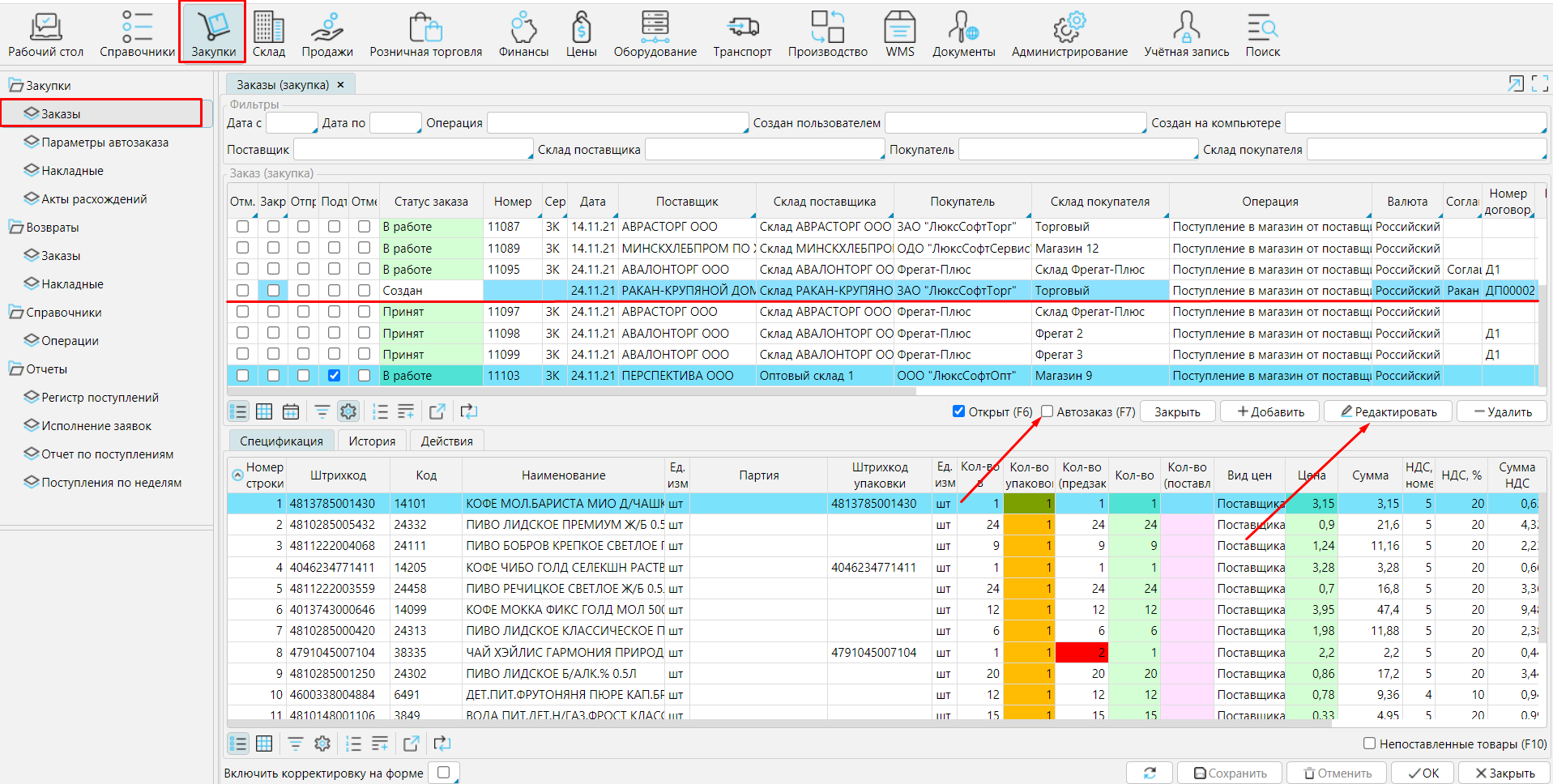 Созданные автозаказы отображаются на форме Закупки - Заказы. Они подсвечены голубым цветом и первоначально имеют статус Создан. На форме есть фильтр Автозаказы, который позволяет отобразить только автоматически созданные заказы. Далее с автозаказом работают как с обыкновенным заказом: чтобы обработать автозаказ его необходимо открыть на Редактирование, проверить данные, при необходимости внести изменения и провести.