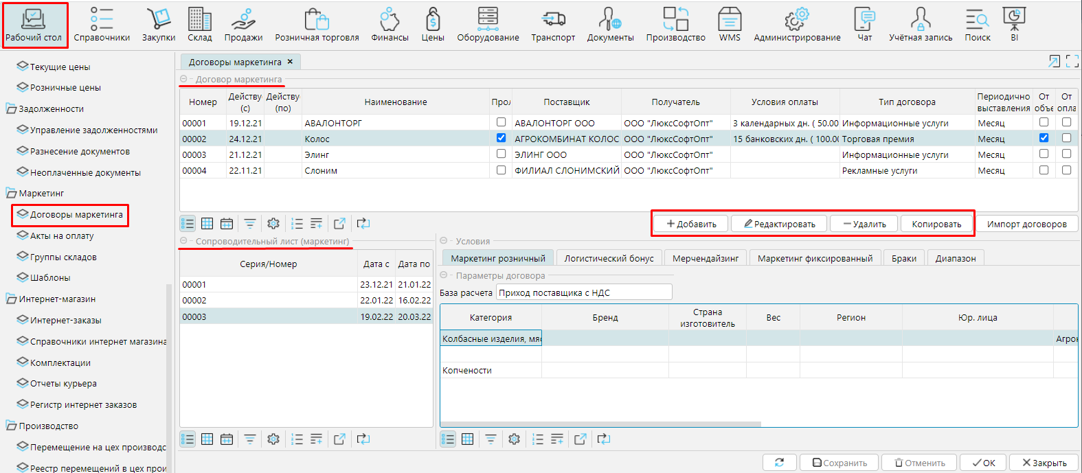 Договоры маркетинга отображаются на форме Рабочий стол - Маркетинг - Договоры маркетинга. Для создания и корректировки договоров предназначены кнопки Добавить, Редактировать, Удалить, Копировать. Также договоры можно импортировать.