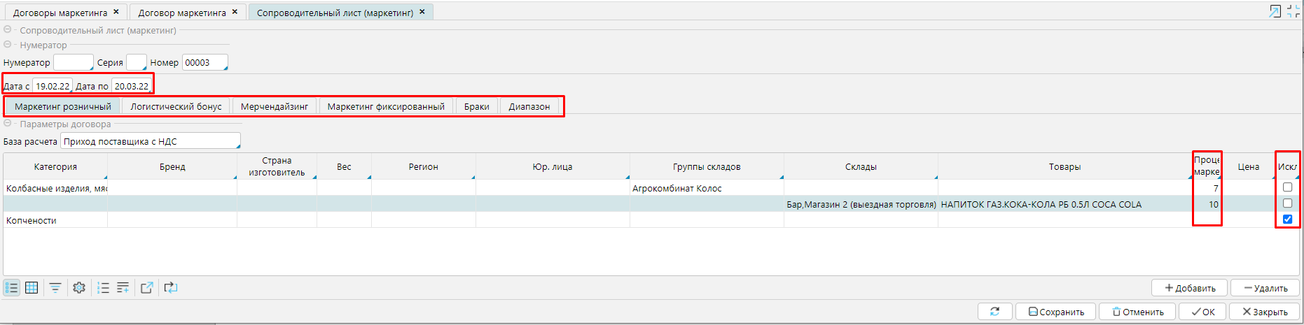С помощью сопроводительных листов задаются условия расчета маркетинговых платежей для договора.