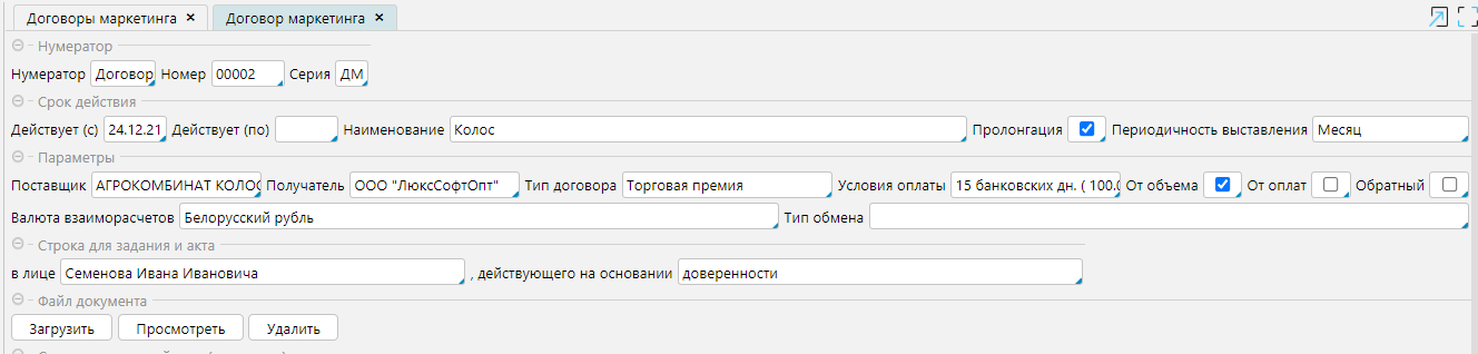 Номер и серия договора могут быть внесены вручную или заполнятся автоматически при настроенном нумераторе.