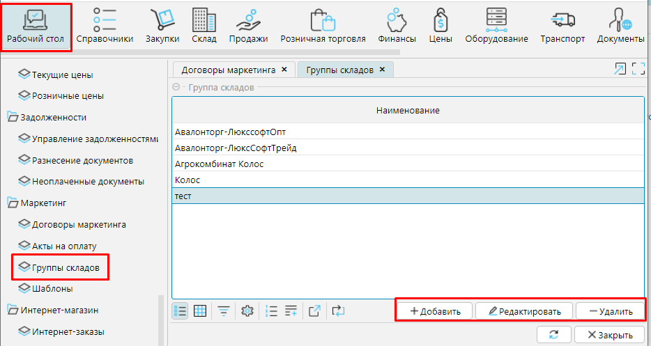 Форма Рабочий стол - Маркетинг - Группы складов содержит список произвольно созданных групп складов, используемых для задания условий при расчете маркетинговых сумм.