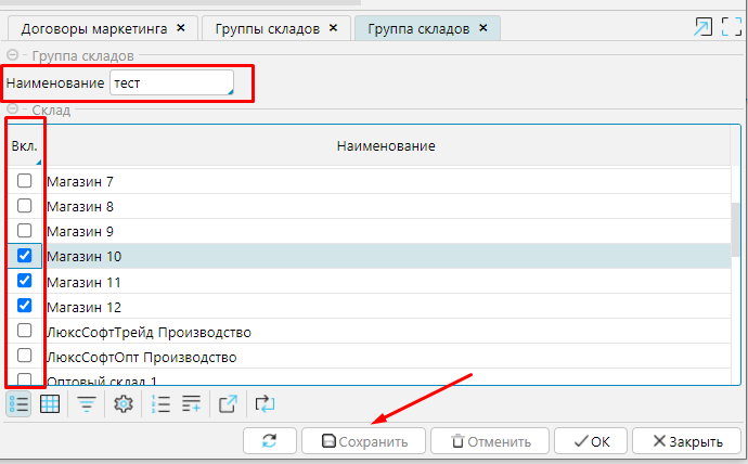 Для группы складов необходимо указать Наименование и отметить в колонке Вкл. магазины и склады, которые в нее входят.