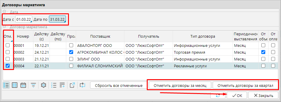 Отм. - отметить договоры, по которым необходимо сформировать акты. Кнопками Отметить договоры за месяц и Отметить договоры за квартал можно быстро выбрать договоры с соответствующим периодом выставления актов.
