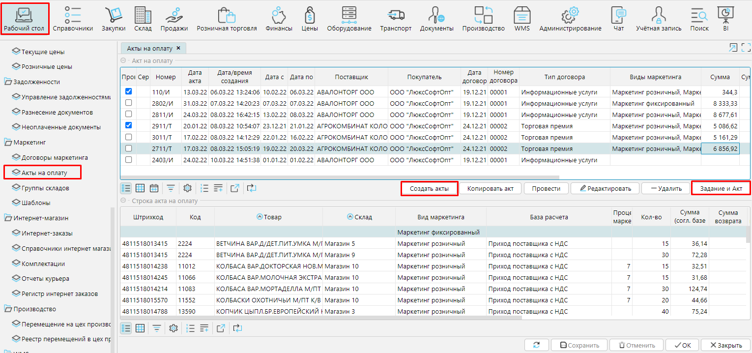 В сформированном акте на оплату в шапке будут указаны основные атрибуты документа в соответствии с договором и выбранным периодом. В акте будут рассчитаны маркетинговые выплаты всех видов, заданных в договоре, по товарам и конкретным магазинам. Для каждой строки акта автоматически определяется процент маркетинга и сумма базы расчета либо фиксированная сумма маркетингового платежа.