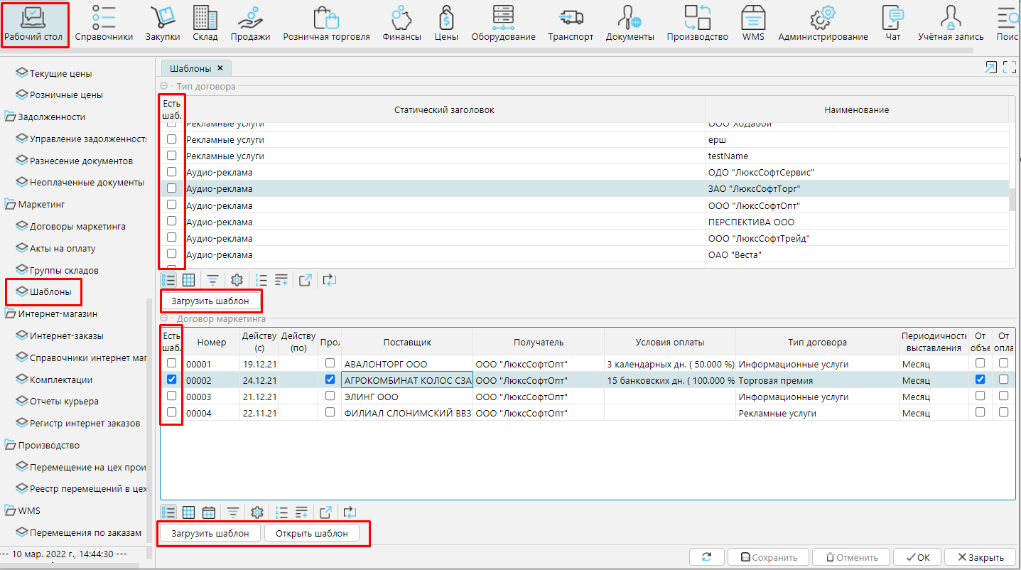 На форме Рабочий стол - Маркетинг - Шаблоны привязывается файл шаблона к типу договора/договору. Надо выделить курсором тип договора или договор, нажать кнопку Загрузить шаблон.