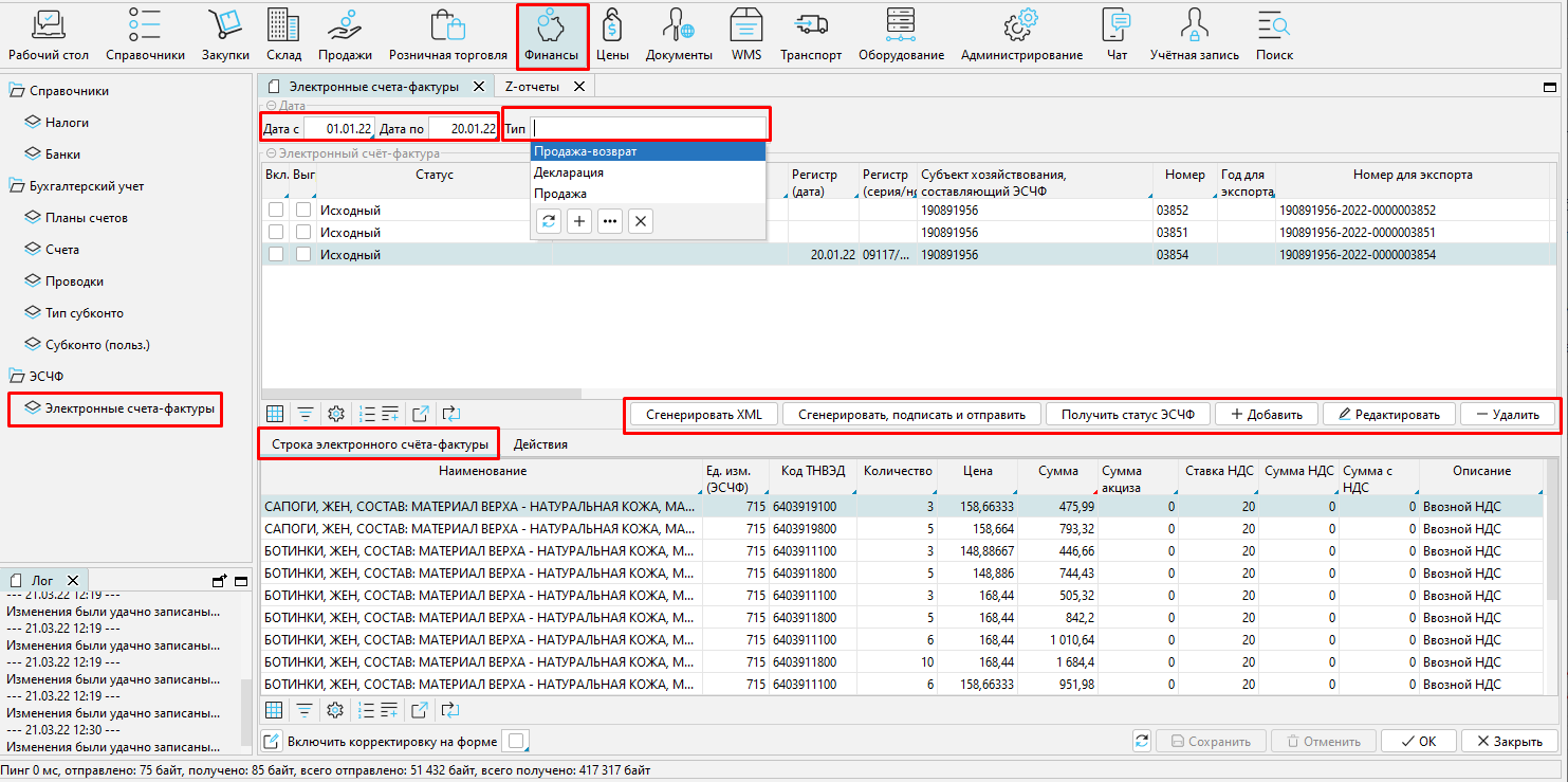 Работа с электронными счетами-фактурами проводится на форме Финансы - Электронные счета-фактуры. В верхней части формы отображаются созданные в системе ЭСЧФ за установленный период.