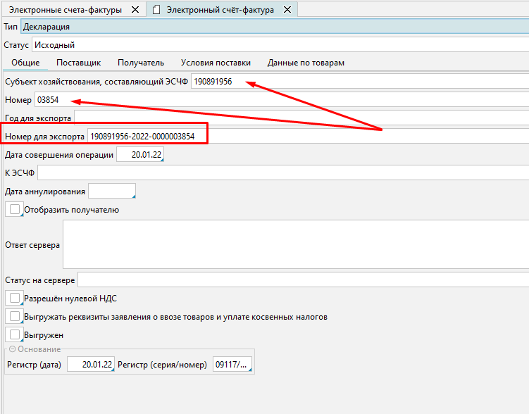 Все данные для ЭСЧФ автоматически подтягиваются из соответствующих документов и мастер-данных. Просмотреть ЭСЧФ можно выделив его курсором и нажав Редактировать (см. рис. 1). Номер ЭСЧФ для экспорта также генерируется автоматически и состоит из: