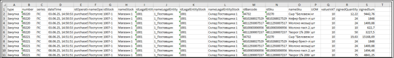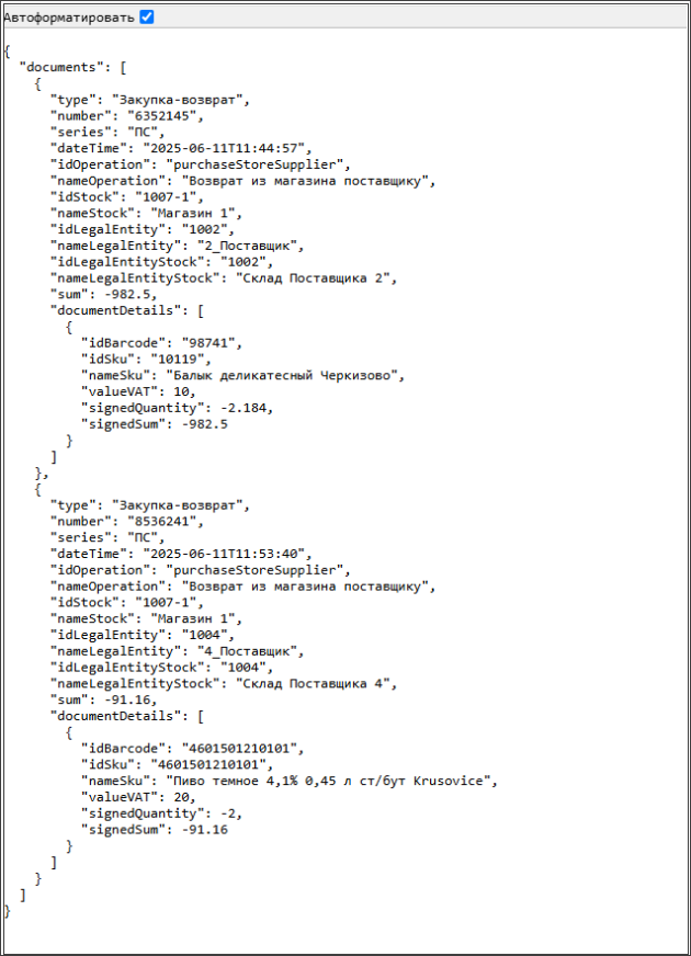 Рис. 4 Пример экспорта документов закупка-возврат в формате