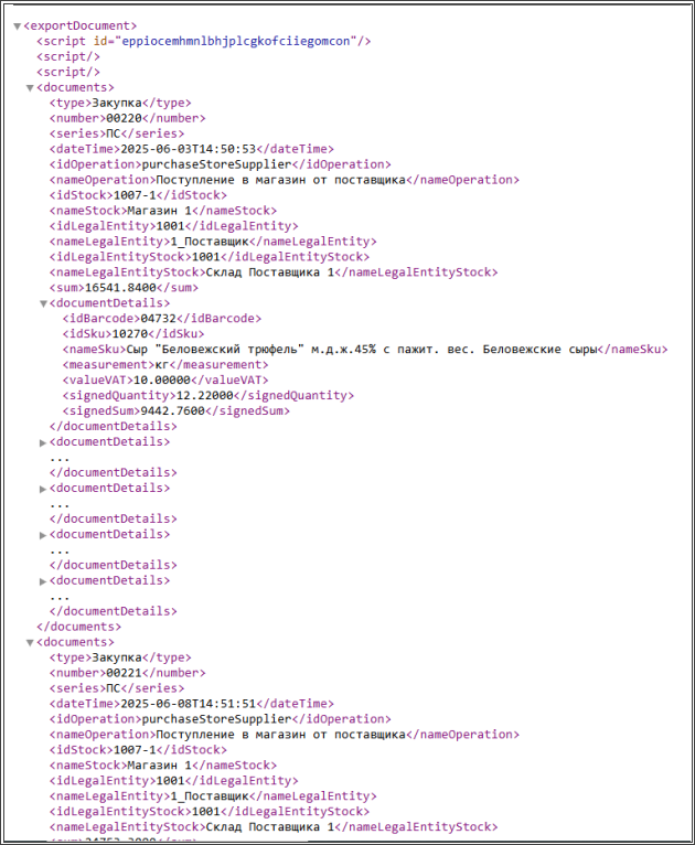 При экспорте документов в файл формата xml данные каждого документа содержатся в элементе < documents >, а данные товарных строк в дочерних элементах < documentDetails > (рис. 3). Если документ не содержит данные по какому-либо элементу, пустые тэги в файл выгрузки не добавляются.